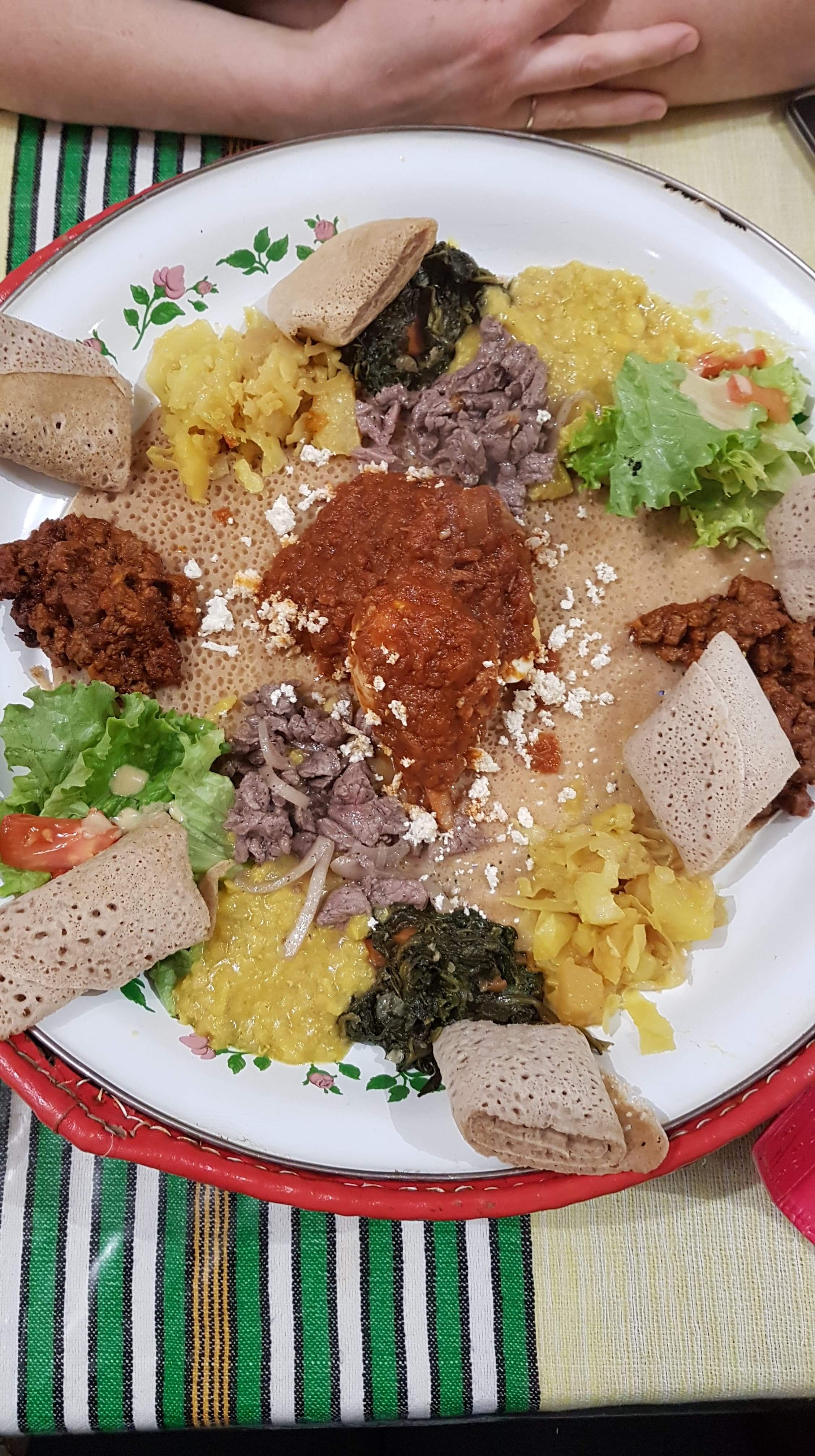 Expérience originale que de partager un grand plat avec ses amis et manger avec les doigts. La nourriture est bonne, le service est au top. Le vin éthiopien plutôt bon . Le tout pour un prix plus qu'honnête .