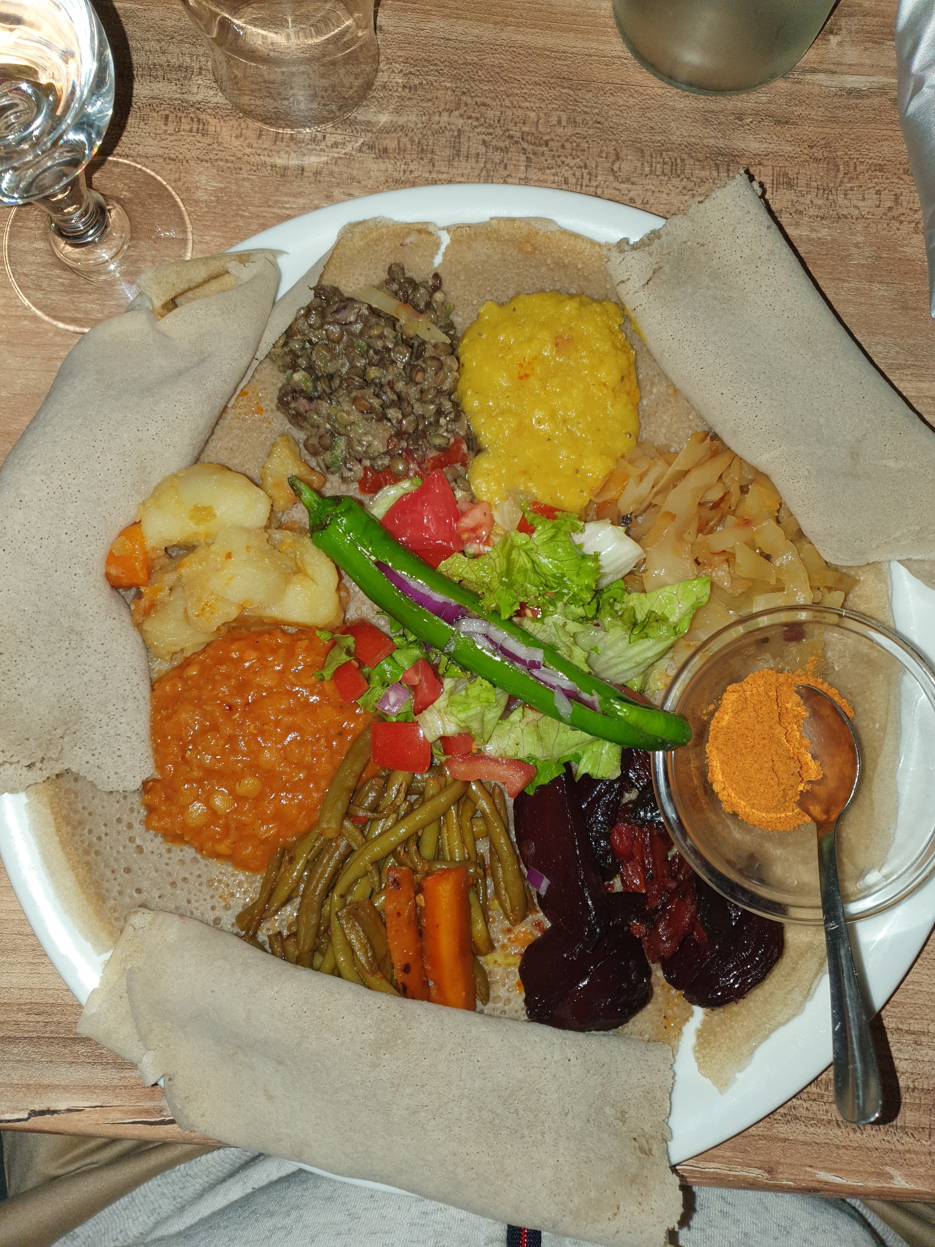 Un délice, une plongee gustative, visuelle et sensuelle dans la culture Abesha. Pour tous les amateurs de bonne cuisine traditionnelle, de produits frais et d'exotisme, qu'ils soient vegans ou carnivore, il y en a pour tous les goûts ! Bon appétit !