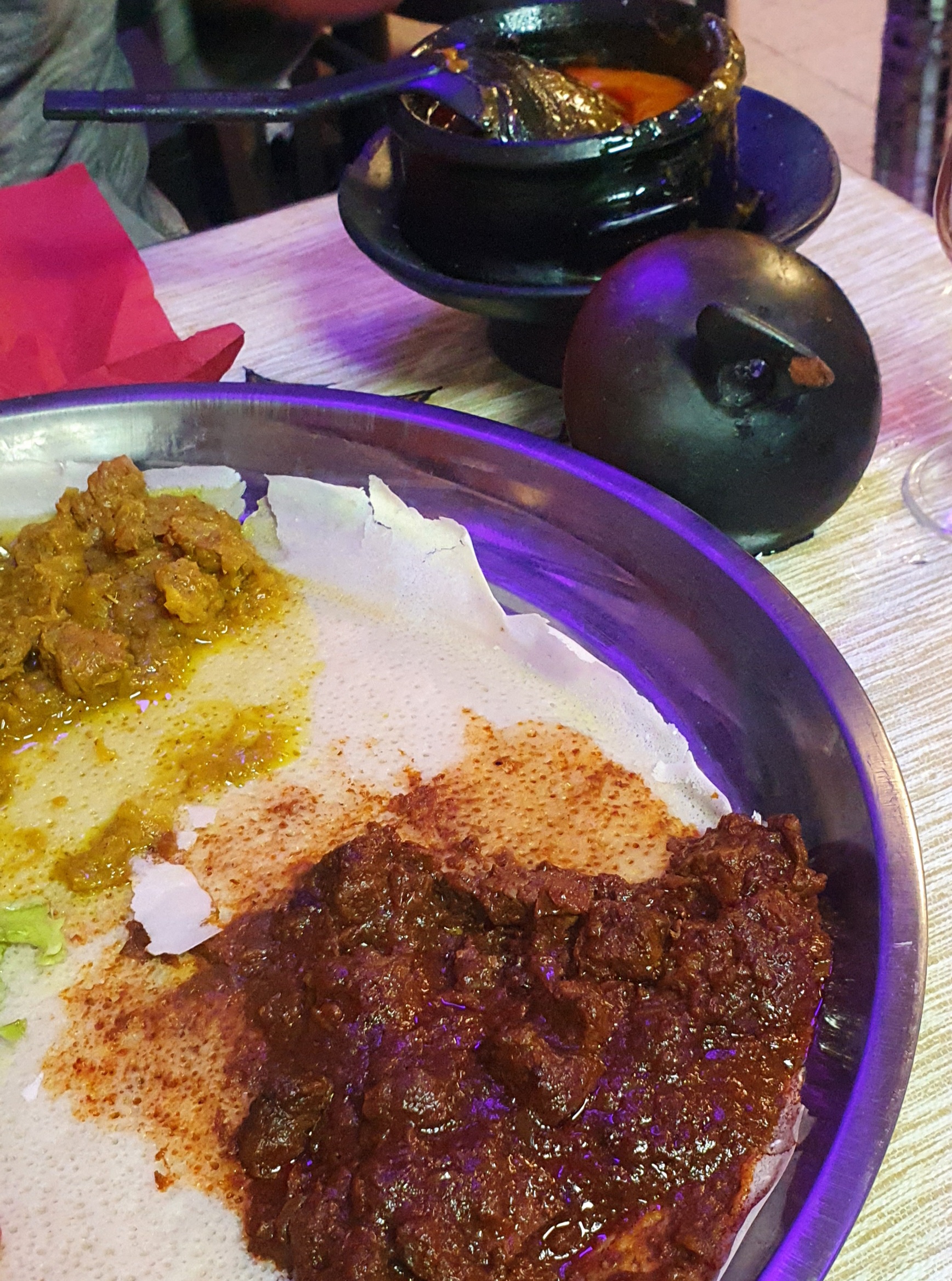 Première expérience avec la cuisine éthiopienne, et c'était aussi la première fois que j'ai mangé avec les mains, une expérience assez unique. La viande était bonne, mais peut-être que certaines épices ne me conviennent pas très bien, et j'ai eu mal au ventre.