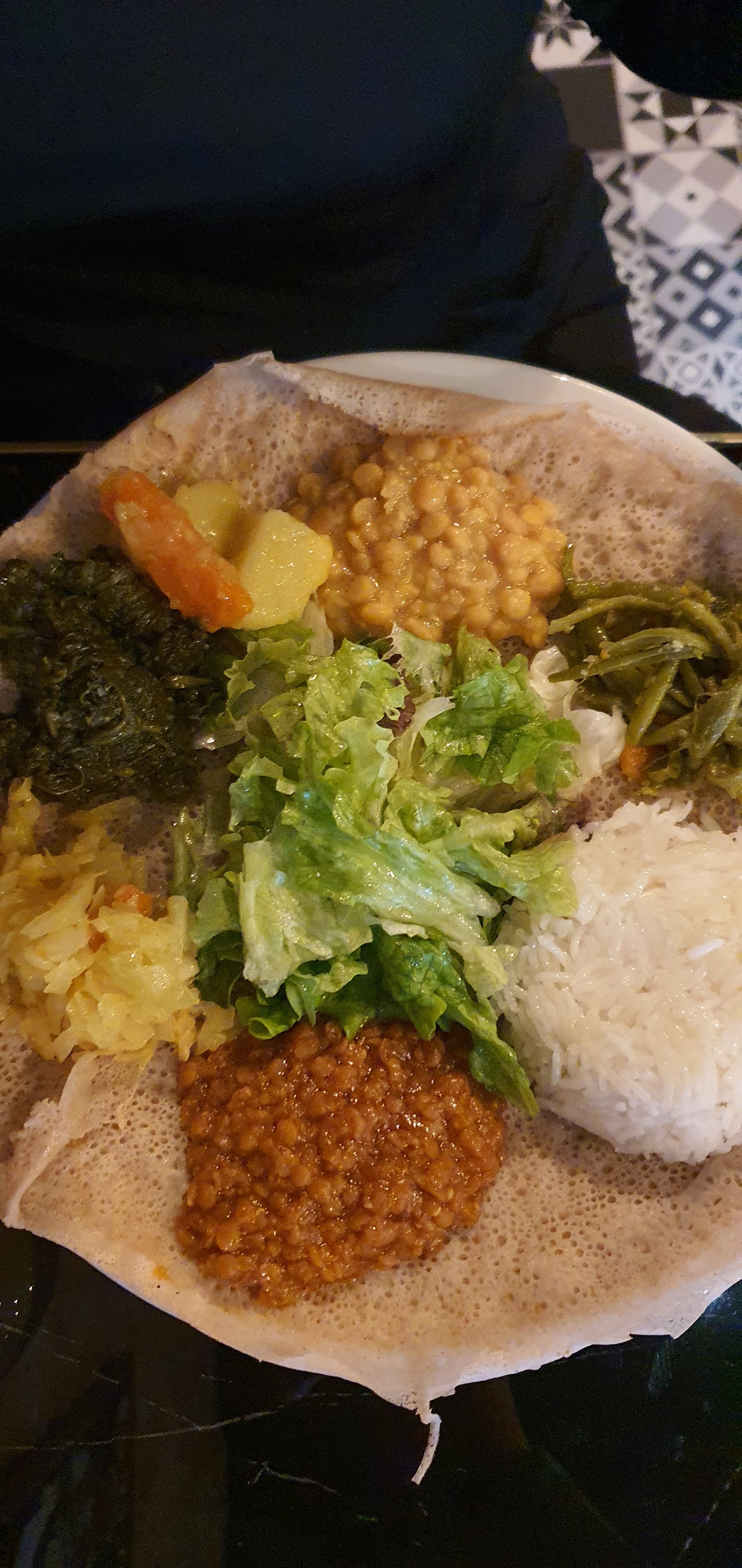 Première expérience dans un restaurant éthiopien ! Les plats sont un délice pour les papilles et la présentation des mets suscite l'émerveillement !!! Très copieux malgré les apparences ! Les quelques objets décoratifs nous mettent dans l'ambiance si on y prête attention. Le service est rapide et impeccable malgré le peu de personnel en cuisine !!!