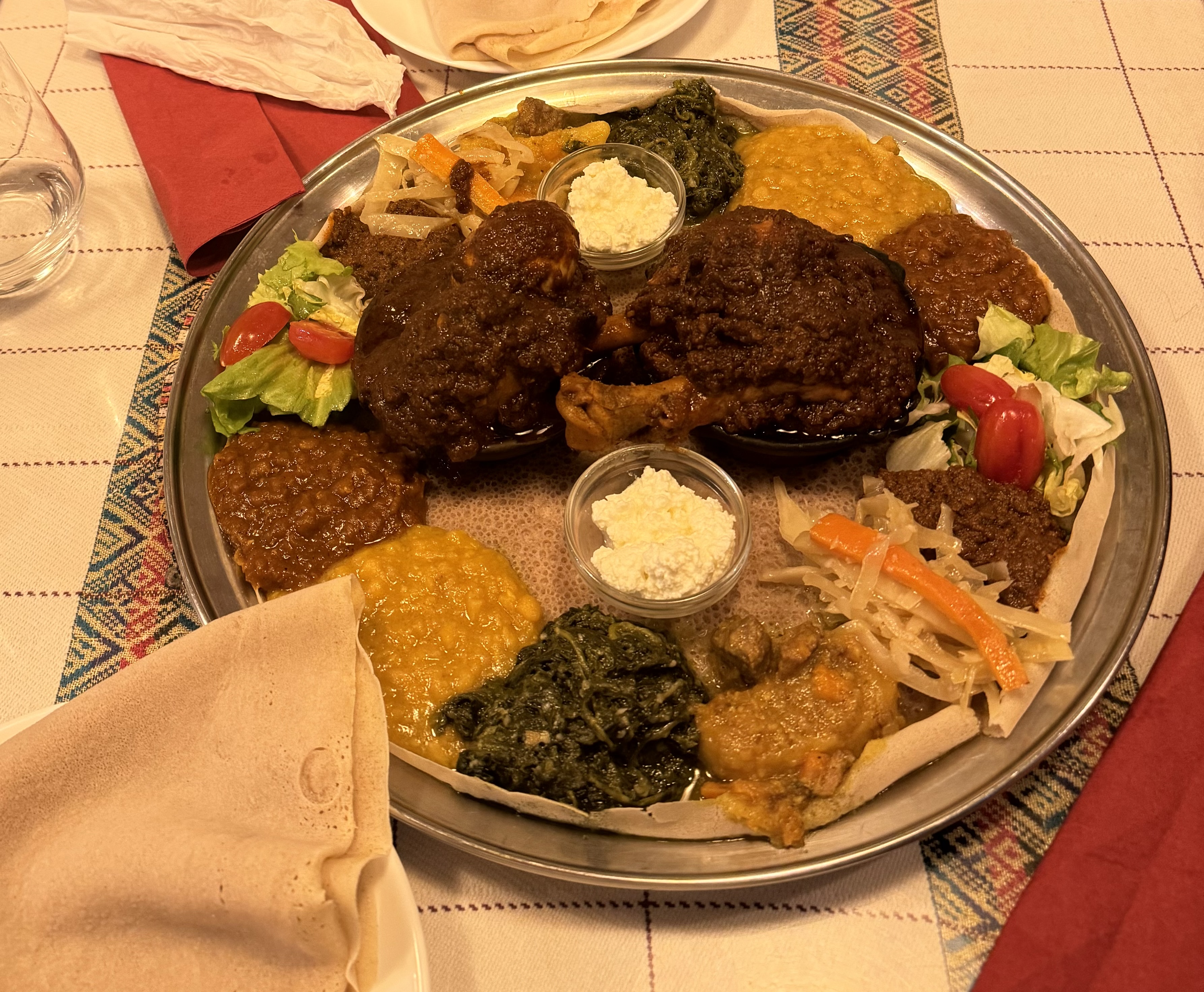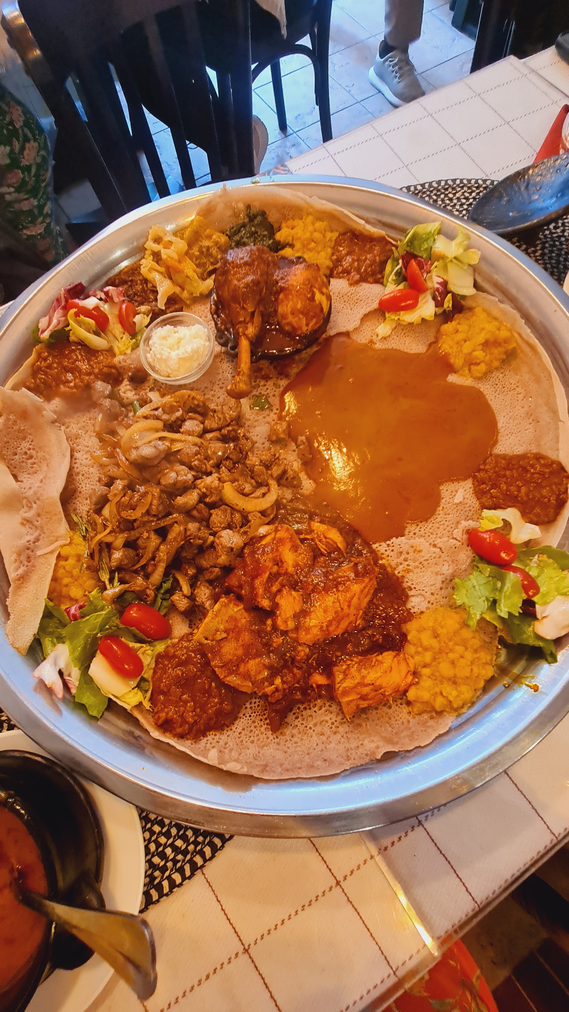 Délicieuse cuisine éthiopienne, hypervariée (4 ou 5 variétés de légumes très bien cuisinés, plusieurs viandes en sauce). Nous étions un groupe mixant végétariens et adorateurs de viande. Chacun a pu trouver son compte. On recommande !